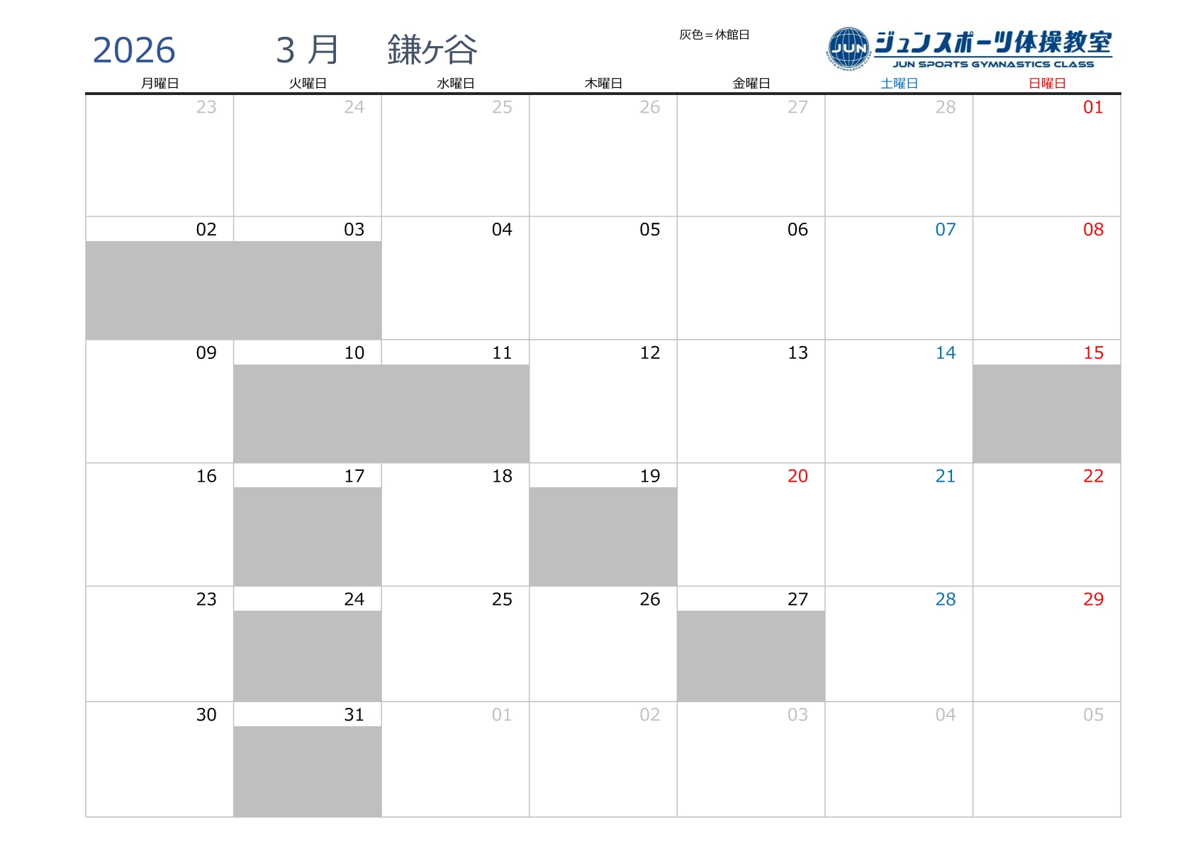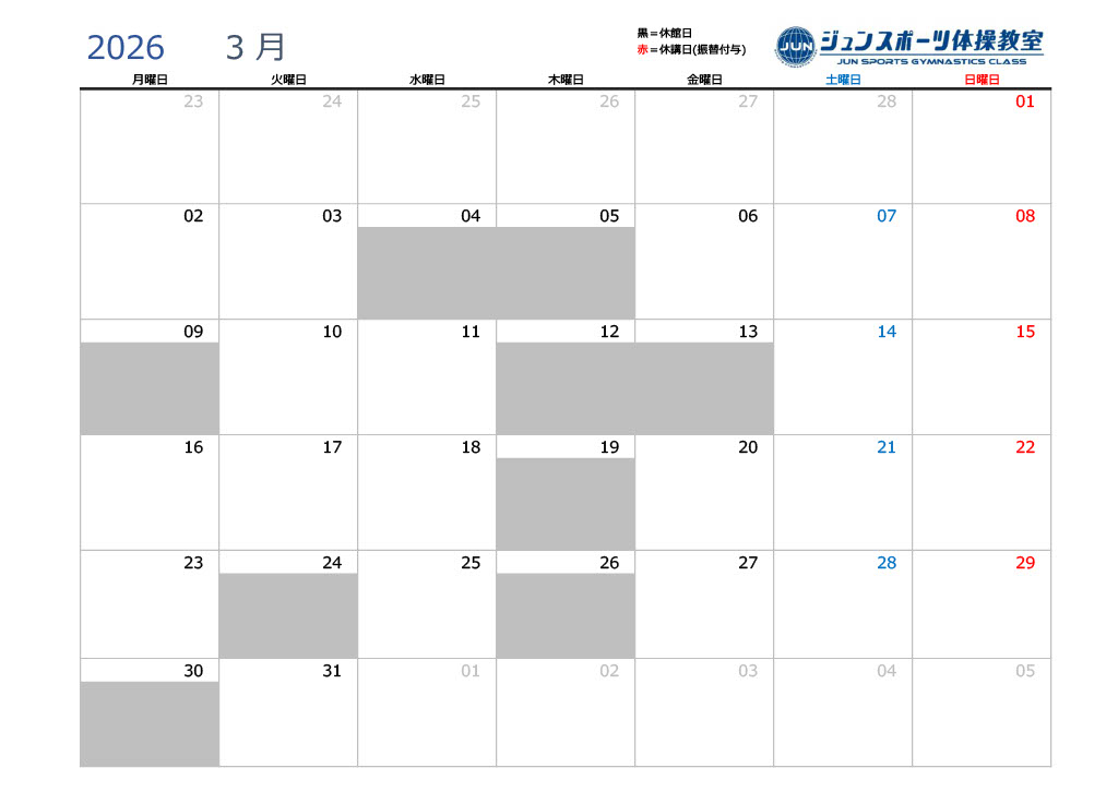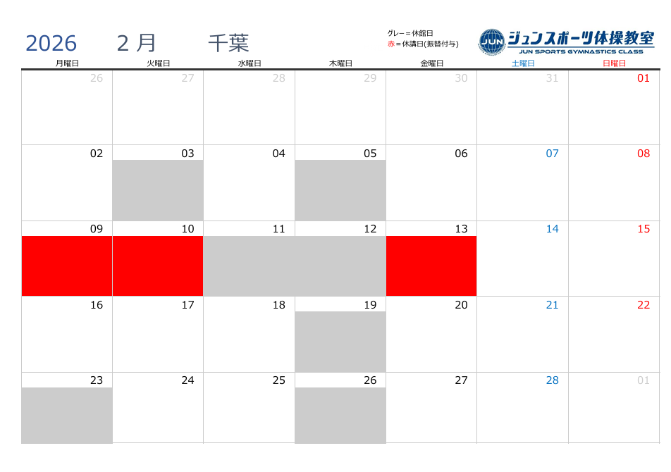 グレー色の日は休館日、赤色の日は休講日となるため、電話/メールでの対応は出来かねます。